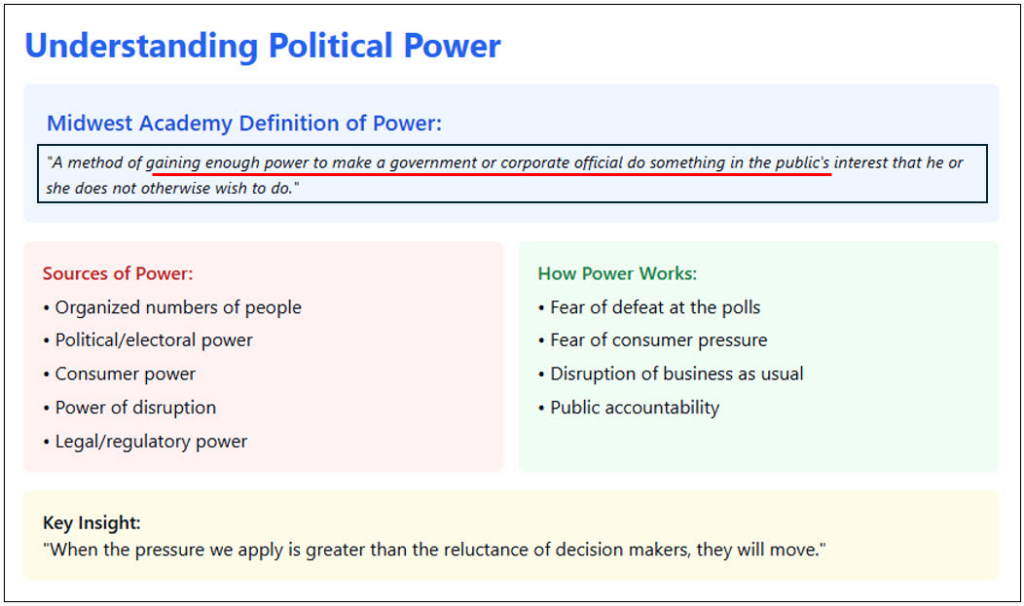 For the second part, let’s look at what is and how to create political power. This is from the Midwest Academy, a nonprofit training institute based in Chicago that teaches people how to build power and win change.